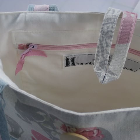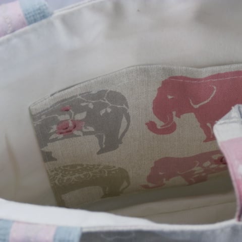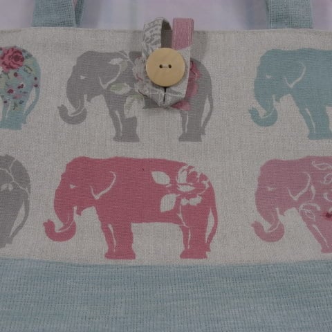 The handles and base of the bag are in a soft furnishing fabric in duck egg , the handles have a stiched pink tape on the inside which has white embroidery pattern down the centre of the tape which was done on my own machine . The lining of the bag is a cream cotton fabric with a large zipped pocket in cream and a patch pocket in the same elephant fabric .Natural coloured button on front .