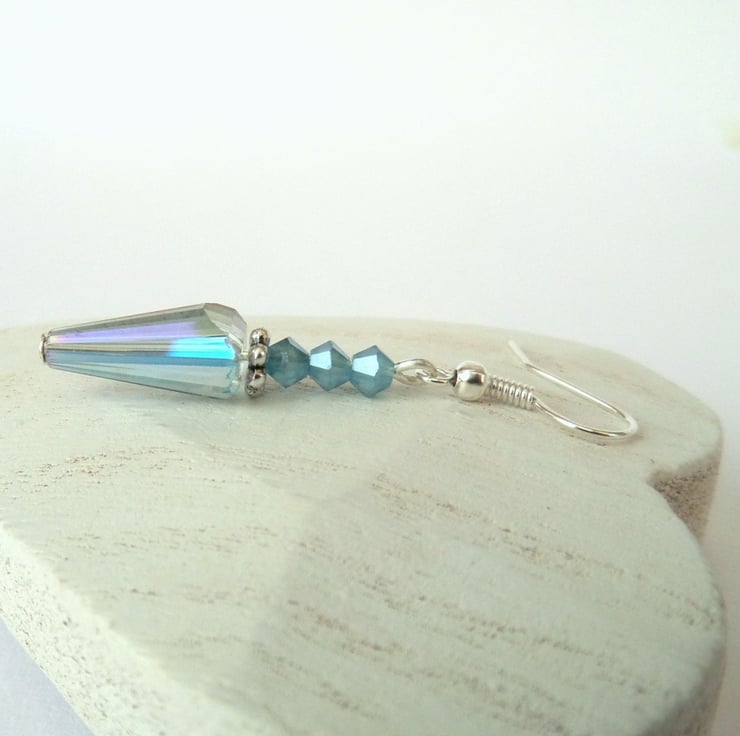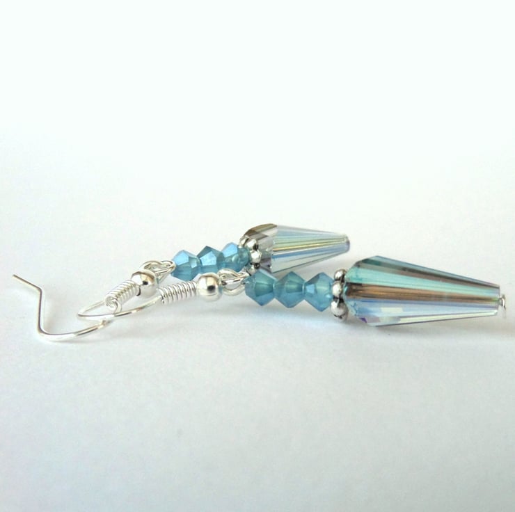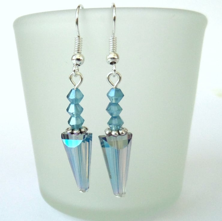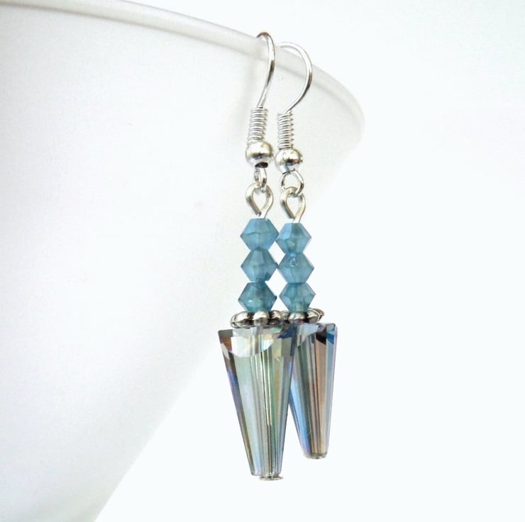 A most unusual pair of earrings, with pointed conical crystals and three smaller blue crystals above them.