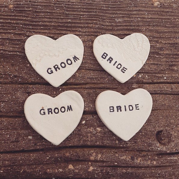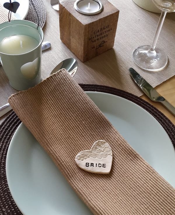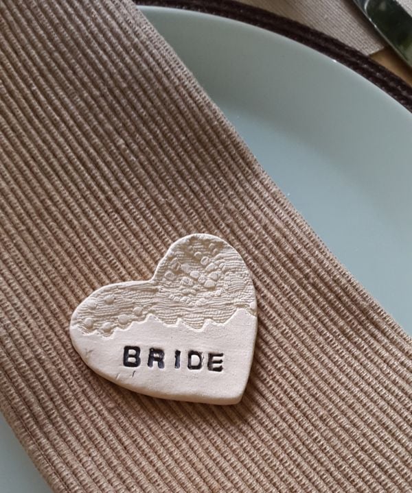 Handmade using an ivory coloured clay, these ceramic hearts are impressed with lace and personalised with any name, initials, word and/or date of your choice.