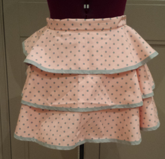 Layered half apron made from 100% cotton fabric. Pink with grey dot & edges trimmed with grey bias binding. Fastens by tie at back made from same fabric.. Size medium, waist 28/30 ins or 71/76 cm.