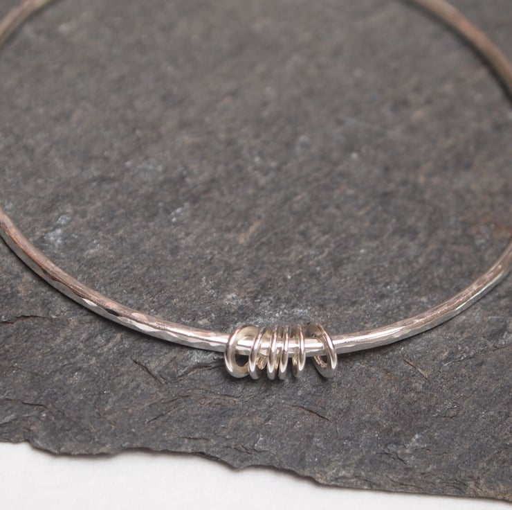 This sterling silver stacking bangle has been gently hammered to add texture and a bit of sparkle as the light catches the silver. I have added 6 little handmade silver washer rings that spin freely around the bangle. This bangle is approx. 2mm thick and looks great stacked with others or worn with bracelets.