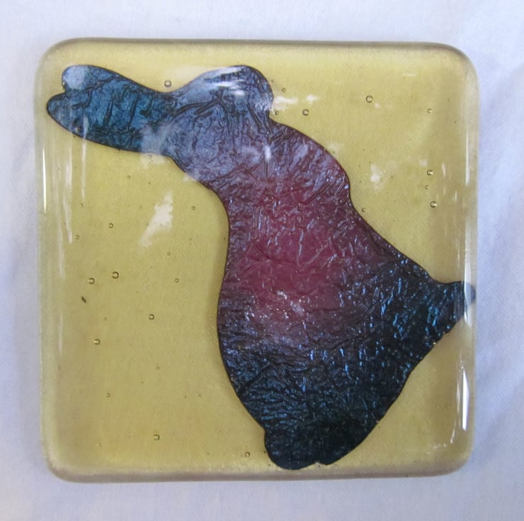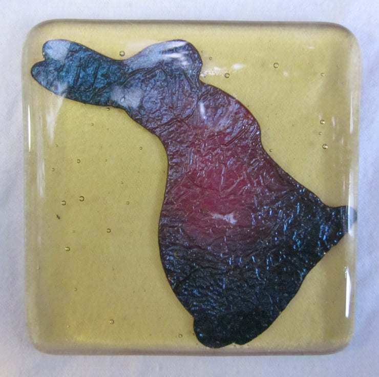 This coaster has a copper rabbit within amber tinted glass. It has been fully annealed to make it strong and is suitable for use with hot tea or coffee cups but not pans straight from the oven. This would make a great gift or stocking filler.