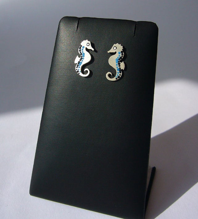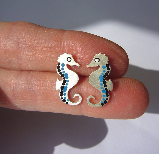 These are simple, seahorse earrings, hand cut out of 1mm thick sterling silver. They are approximately 1cm wide and 1.8cm high and are painted on with enamel paint. Sterling silver ear pins are soldered to the back.