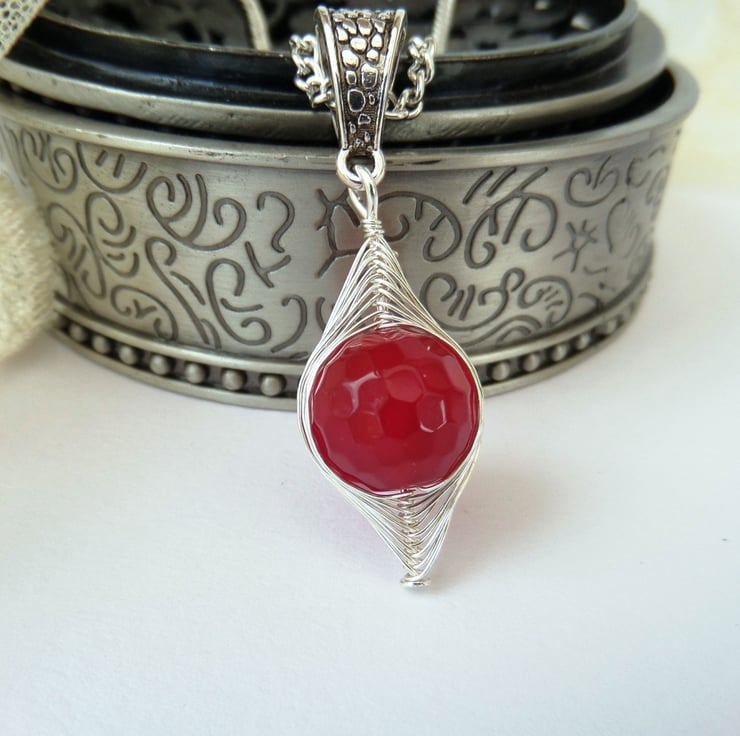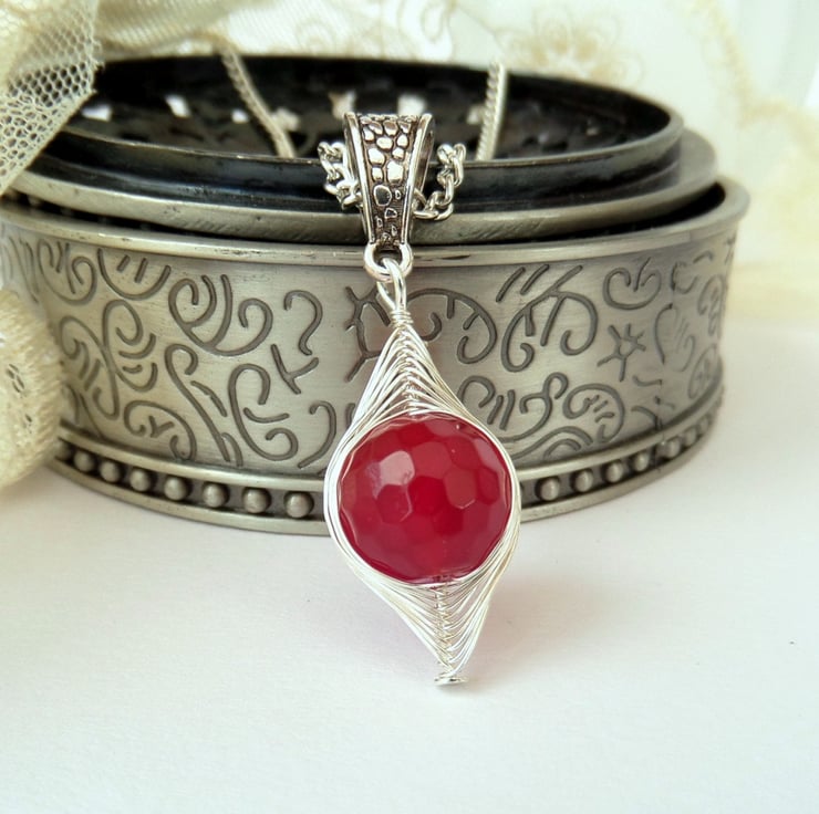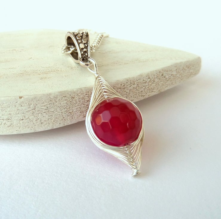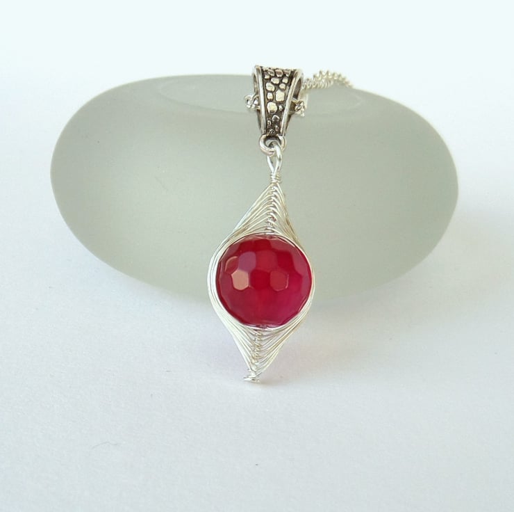 A stunning pink agate gemstone wrapped with silver coloured wire makes a gorgeous and unique pendant necklace.