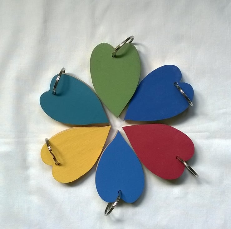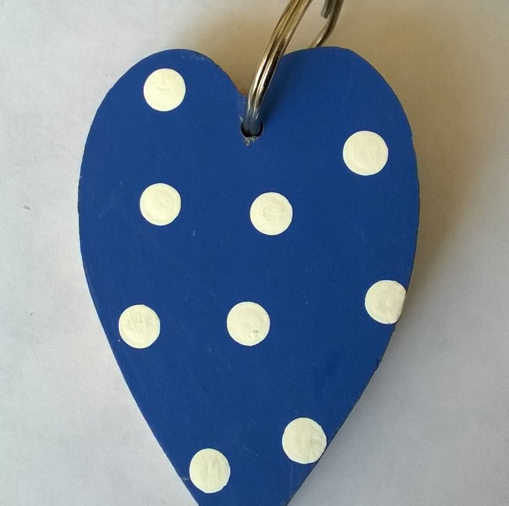 Hand painted heart shaped wooden key ring, spotted on the front and plain on the reverse.