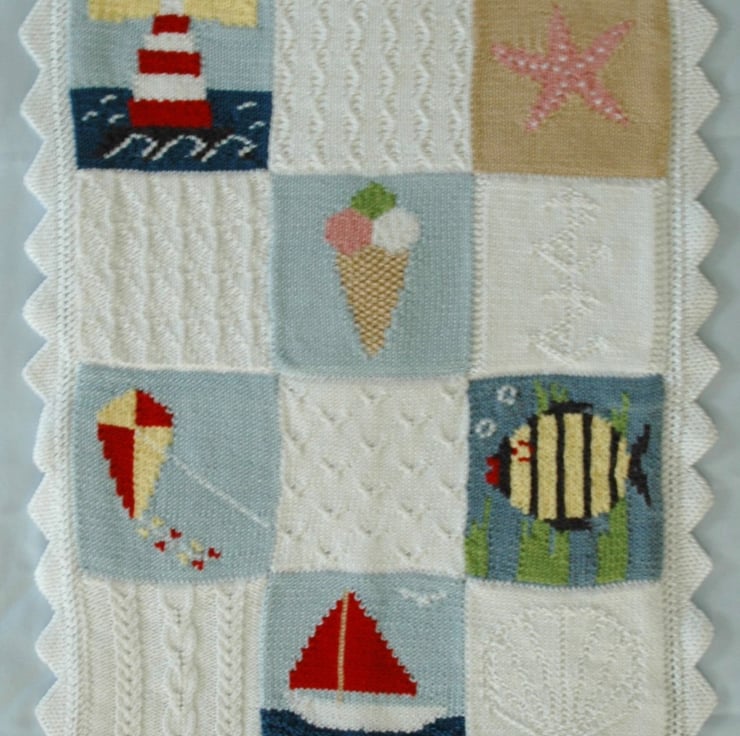 Knitting kit for a small Seaside Baby Blanket. The pattern is NOT included, please order a PDF copy from my Knitting Patterns collection or message me if you would prefer a printed copy on good quality paper. There is a choice of edging: White or Blue.
