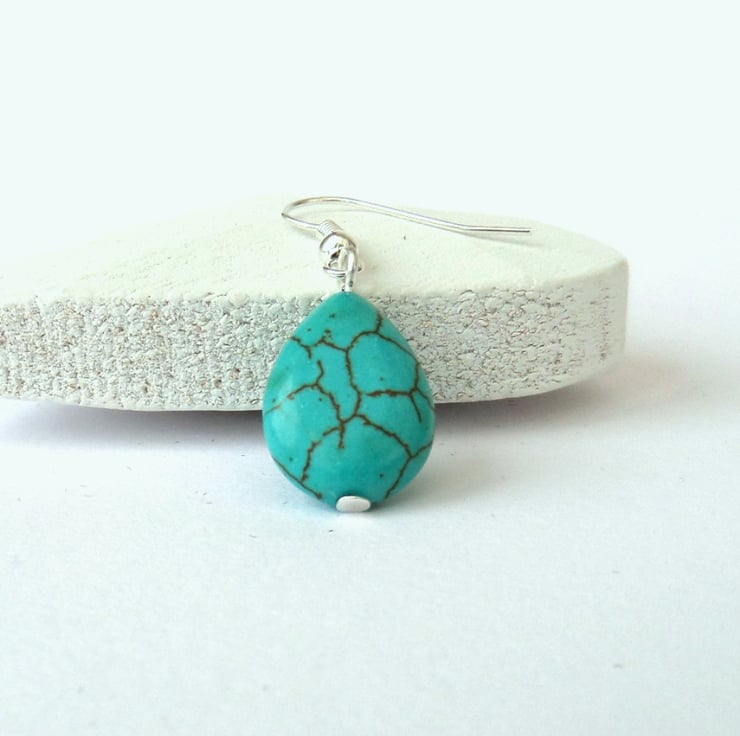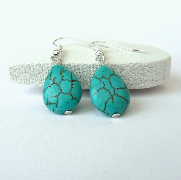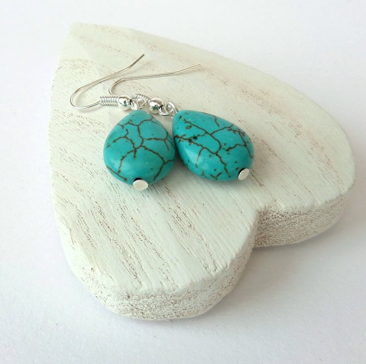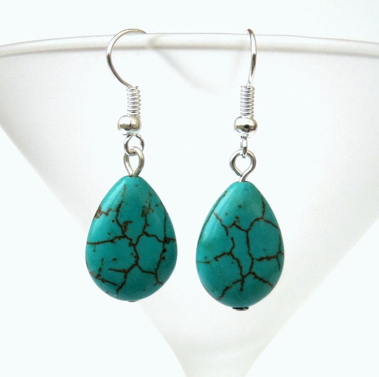 Turquoise earrings, handmade with teardrop shaped pieces of turquoise hanging from silver plated wires.