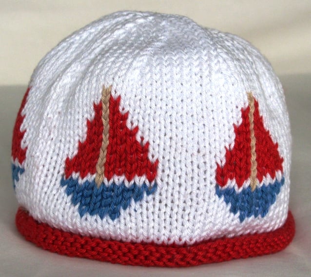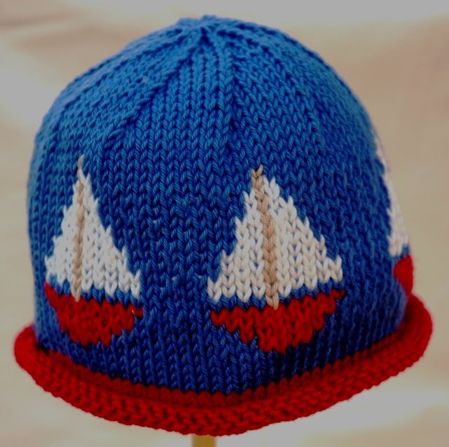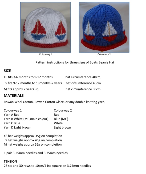 This is a knitting PATTERN for a simple beanie hat design worked on two knitting needles with a boat motif placed evenly around each hat. There are written instructions and charts to follow for each size and suggestions in the pattern for how to knit the motifs.