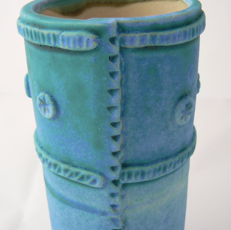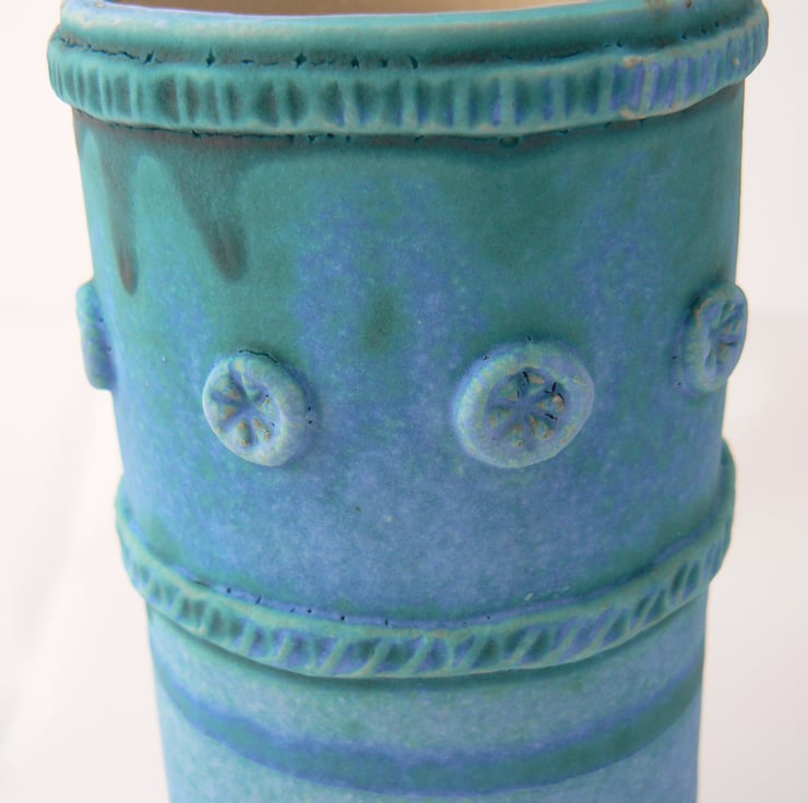 A stoneware ceramic vase with with impressed details. The clay I use fires off white and has small specks of white grog in the body making it quite robust. Outside is glazed in a dry turquoise glaze which highlights the raised decoration, inside there is a clear shiny glaze to make cleaning easier.