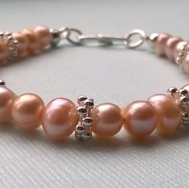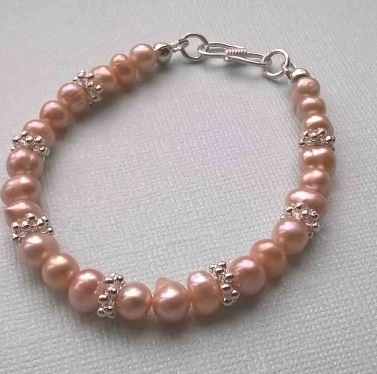 A classic pearl bracelet made with peach cultured pearls interspersed with snowflake spacer beads and finished with an S-hook clasp.