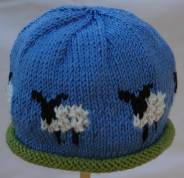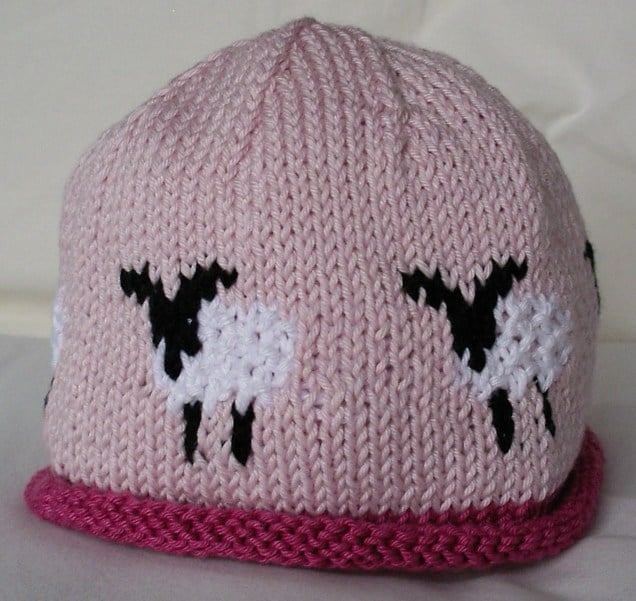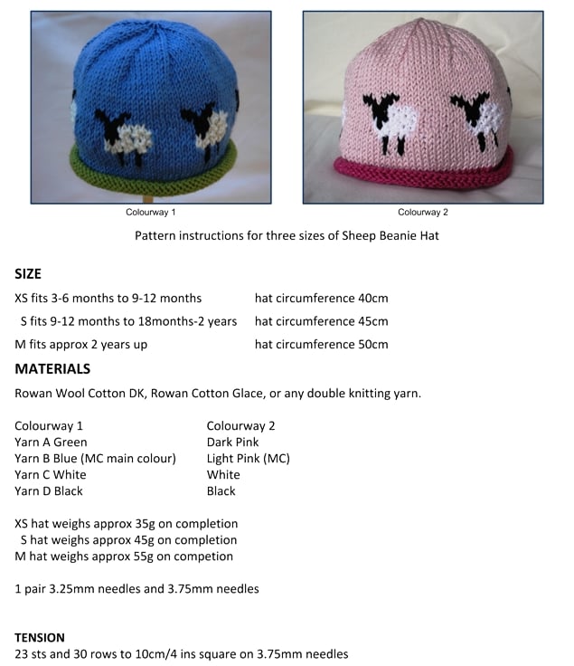 This is a knitting PATTERN for a simple beanie hat design worked on two knitting needles with a sheep motif placed evenly around each hat. There are written instructions and charts to follow for each size and suggestions in the pattern for how to knit the motifs.