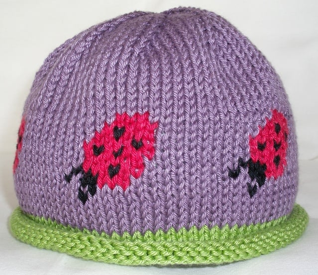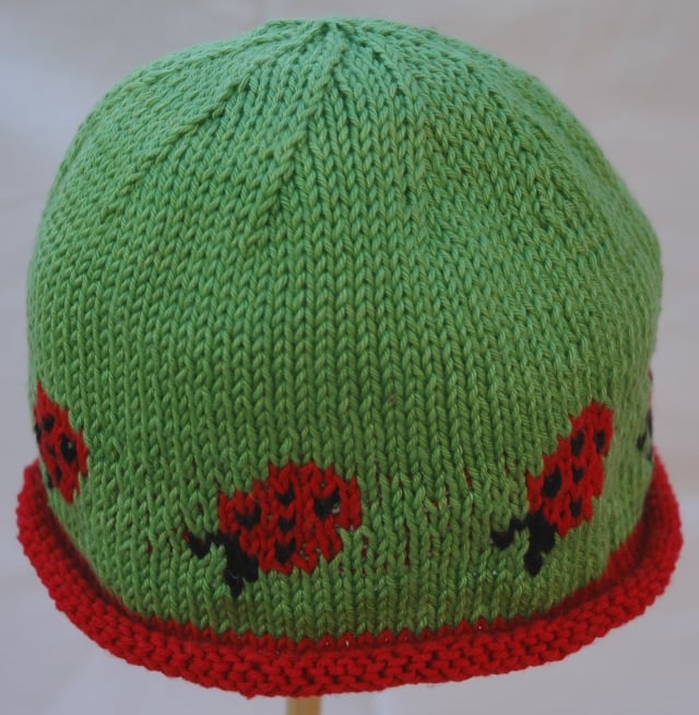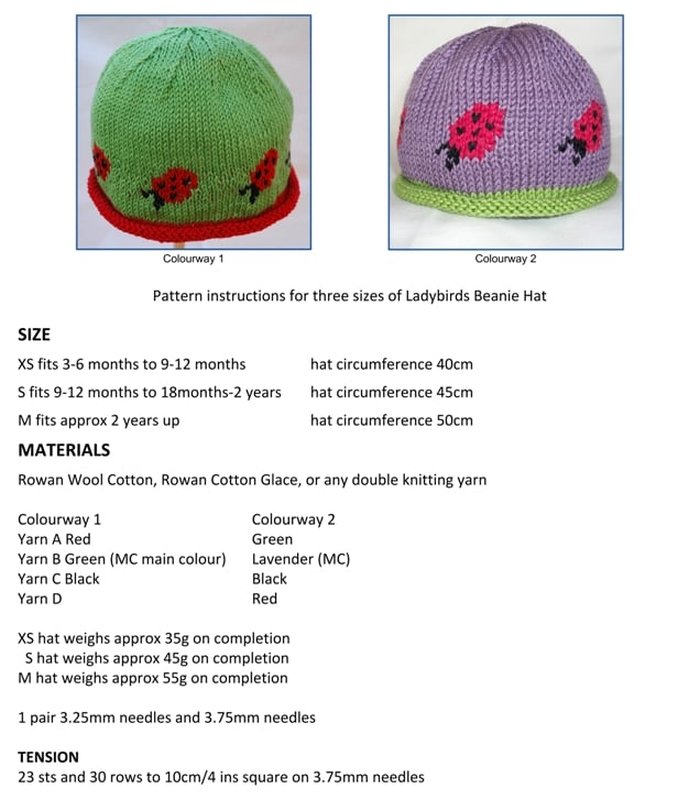 This is a knitting PATTERN for a simple beanie hat design worked on two knitting needles with a ladybird motif placed evenly around each hat. There are written instructions and charts to follow for each size and suggestions in the pattern for how to knit the motifs.