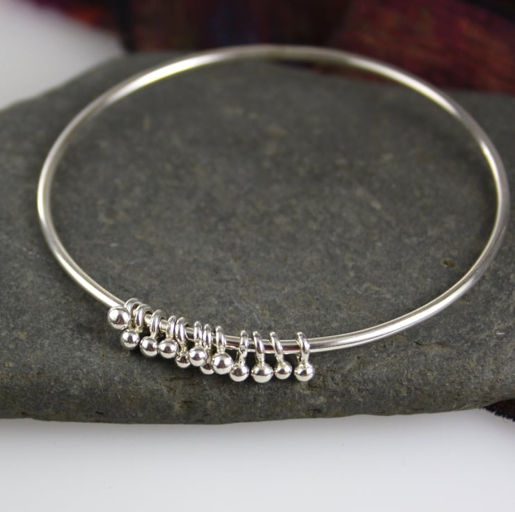 I have used 2 mm silver for the bangle and added a fringe of 12 silver bobble rings. The metal has been given a bright shiney finish that catches the light beautifully.