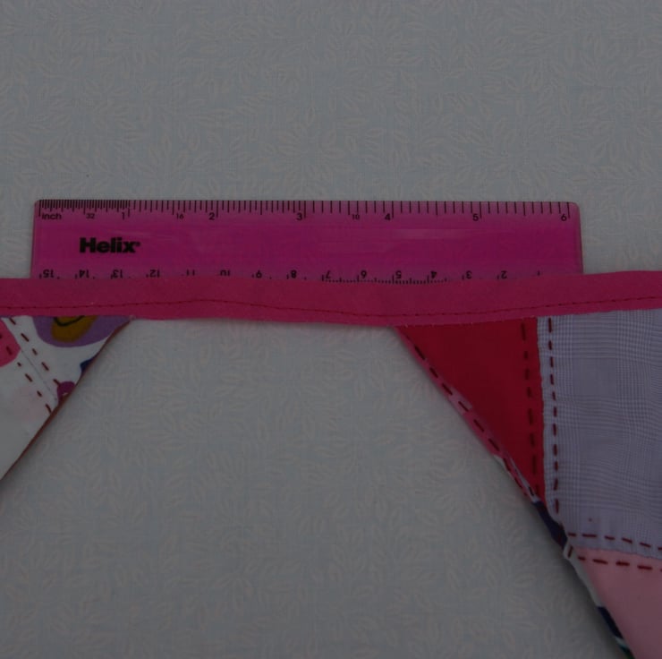 The triangles’ have been connected together along a length of pink bias binding. This has been top stitched on my sewing machine with pink cotton.