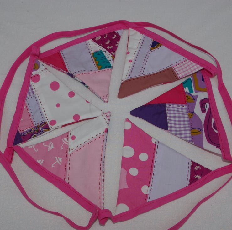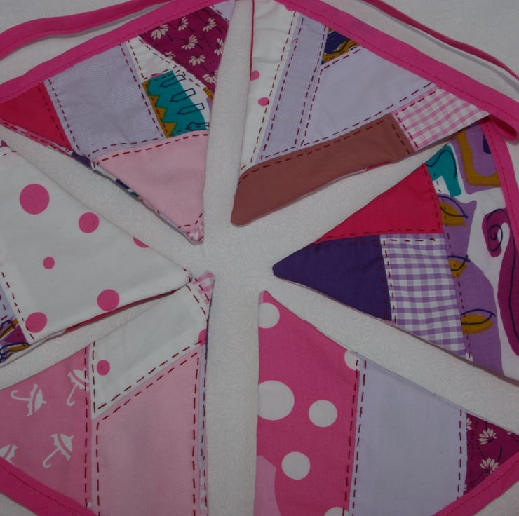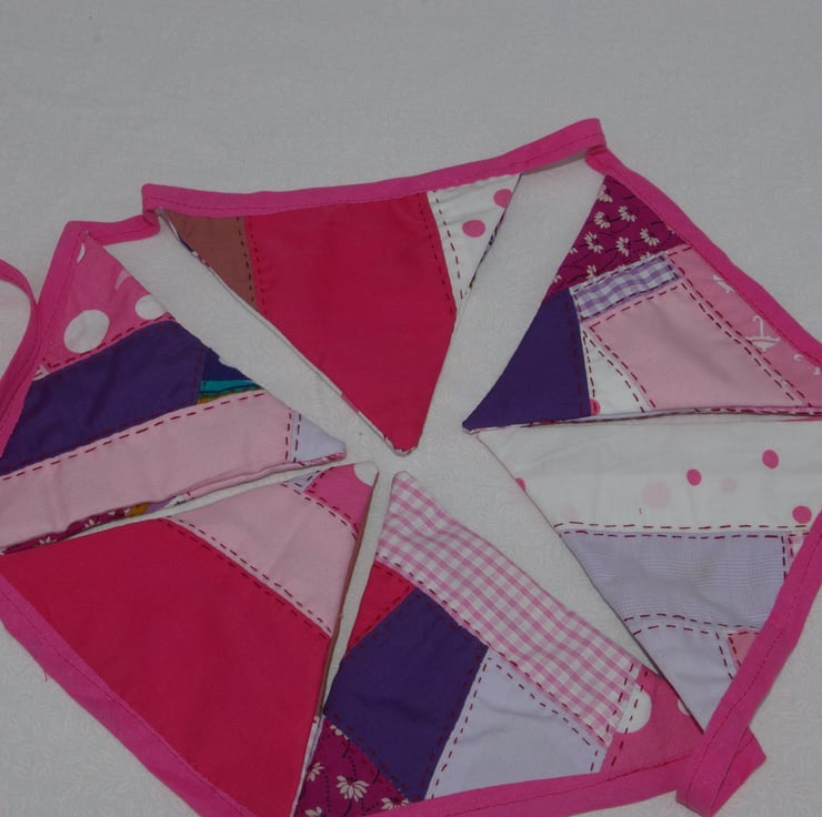 The triangles have been created from different cotton and polyester-cotton materials. The main colours used in this string of Bunting are pinks and purple with small splashes of other colours.