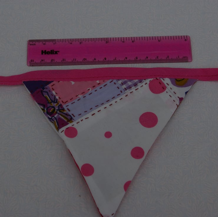 A length of double sided pink and purple patchwork bunting, containing six patchwork triangles. Each triangle has been hand sewn and top stitched in a dark pink cotton thread.