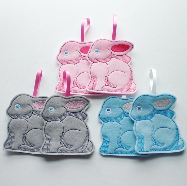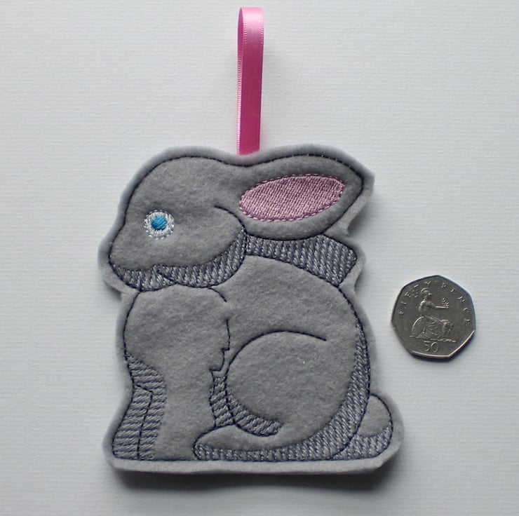 One hanging bunny, embroidered treat bag made from felt.