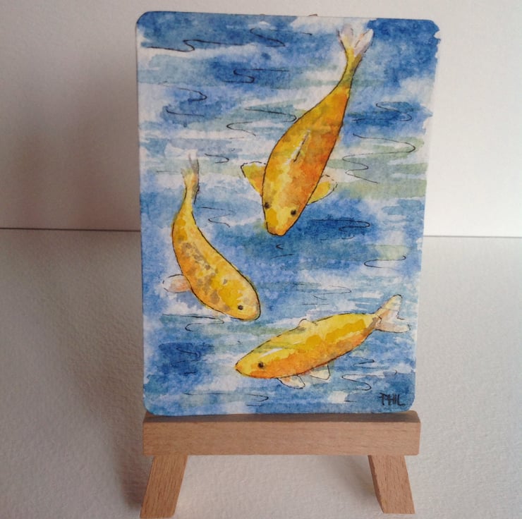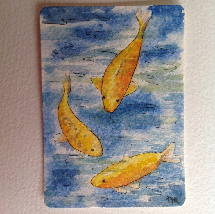 This ACEO is an original, handpainted watercolour of three Koi carp swimming in a pond.