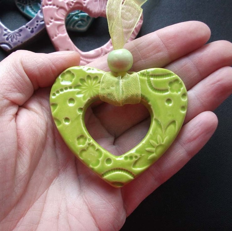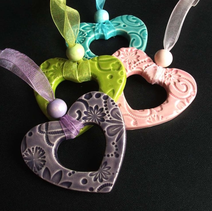 These cute little hearts are made from white earthenware clay. They are embossed with pattern and finished in a rich, glossy red glaze.