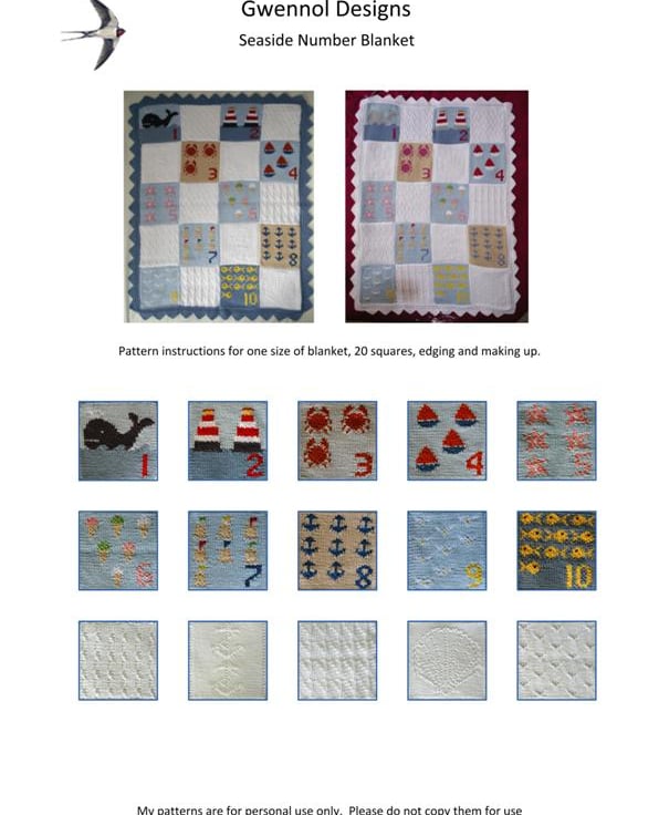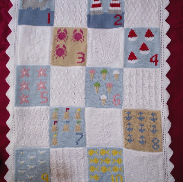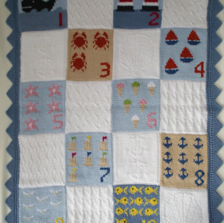 The pattern is written as colour charts and written instructions in standard UK knitting terminology. There are 10 one shade squares in textured knitting (5 designs x 2) and 10 "picture" squares with numbers 1 to 10 reflecting a seaside theme. They are knitted from bottom to top in strips then sewn together vertically. The edging is knitted separately then sewn on. You will need to know how to do intarsia and fair isle to knit this pattern.
