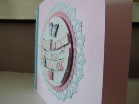 A very pretty feminine design of a decoupaged circle with the words Celebrate, Its your once a year day. Mounted onto a die cut intricate cut out circle of pale turquoise spotty card. Then mounted onto quality white card which has been hand shaded in pale pink. Finished off with pale turquoise ribbon