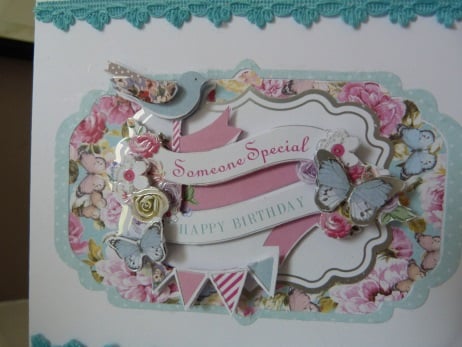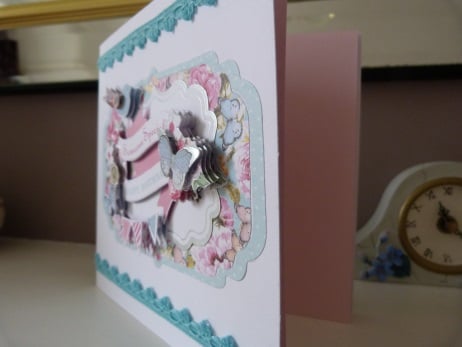 A very pretty design of butterflies and bird decoupaged onto white with silver edged decal. Mounted onto floral c-ordinating card and edged with pale turquoise spotted card. All then mounted onto pristine white quality card. Finished off with pale turquoise ribbon