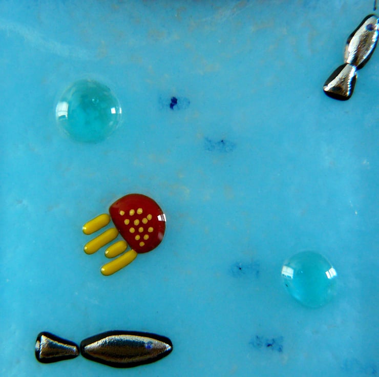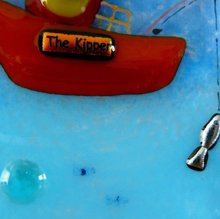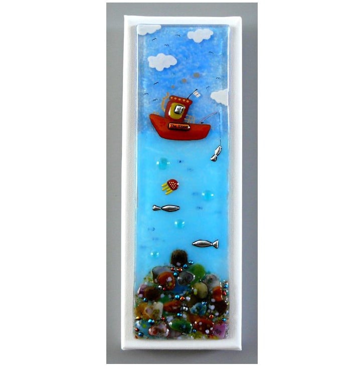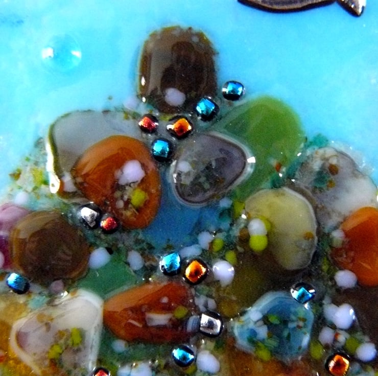 This panel started off being a transparent sheet of bullseye glass. I then built upon it putting on the different coloured layers, glass frit, dichroic glass, glass boat and mosaic pieces. Once the image is carefully tidied up, the glass picture is fused in a kiln. The firing of the picture takes up to 24 hours as the kiln must be cooled very gradually to avoid breaking the fusing glass.