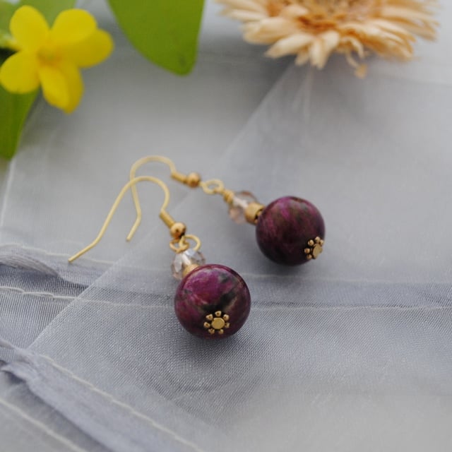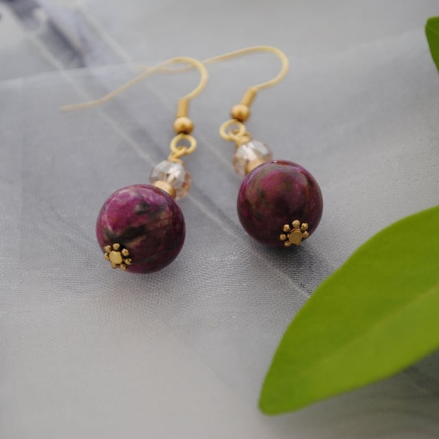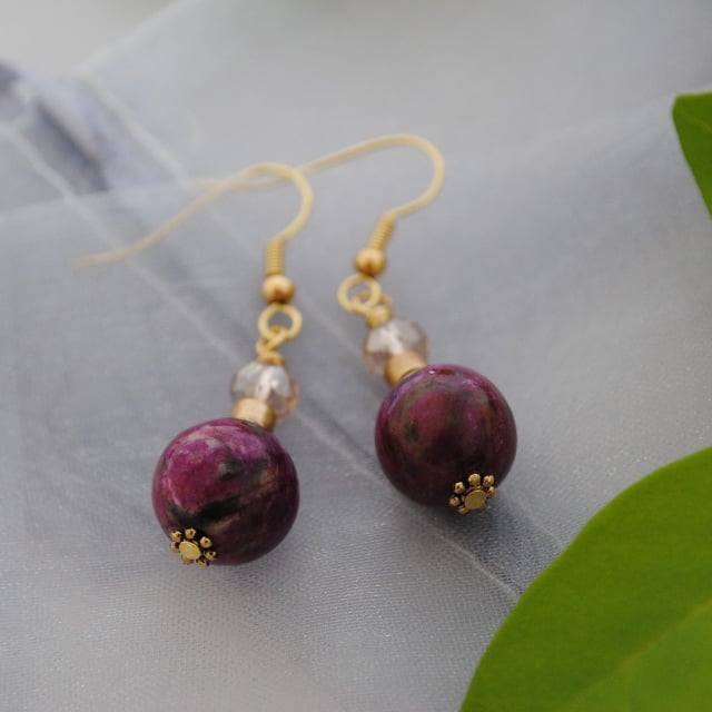 Purple Jasper earrings - these earrings are made with 12mm purple jasper semi-precious beads with antique style champagne rondelle beads, antique gold daisy spacers and gold heshi beads. The beads are hand-wrapped to gold-plated earrings.