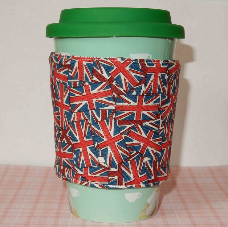This cosy is designed to fit travel mugs similar to the one in the photo (mug not included). It is approximately 3.25 inches deep and fastens with Velcro. It is reversible with the London icons on one side and the Union Jack print on the other side, and a layer of cosy wadding.