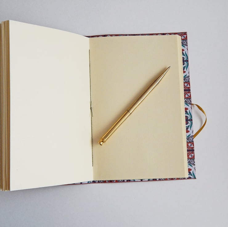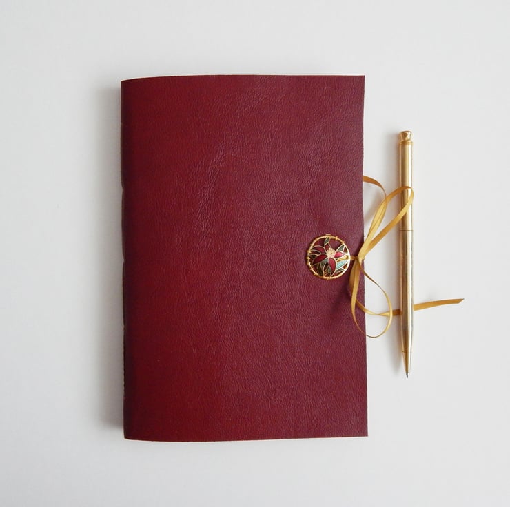A chapbook style journal in deep red leather, with an enamelled Art Nouveau style cameo decoration on the cover and gold ribbon tie fastening. A beautiful present for a special friend, lovely for writing, drawing or note-keeping.