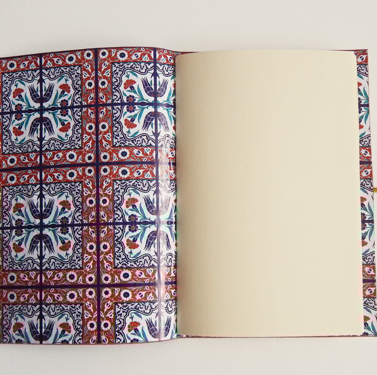 The cover is lined with paper depicting an Art Nouveau / Arts and Crafts, Turkish Isnik-inspired Tile design in dark blue, red and viridian green on a white background.