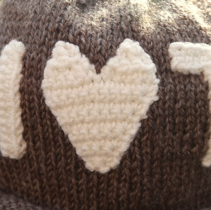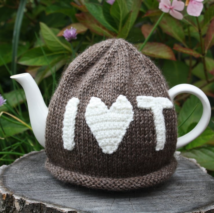 Hand knitted brown tea cosy with "I Love T" crocheted in cream wool and appliqued on. Made with Sirdar Wool Rich Aran which will keep the teapot nice and warm. Will fit a standard 4 - 6 cup teapot.