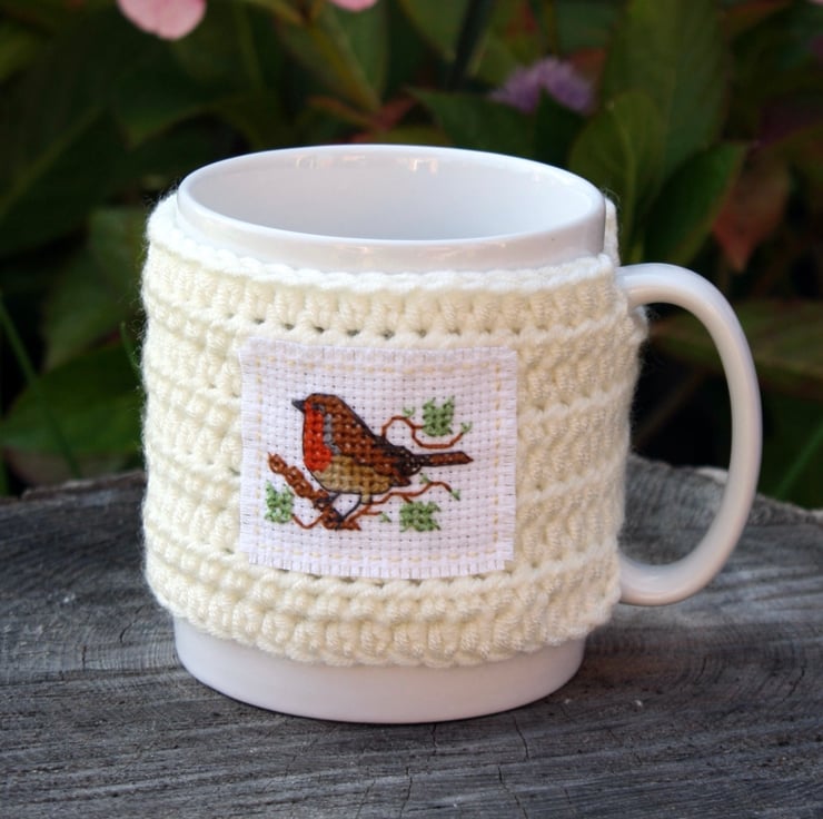 A pretty cream crocheted mug cosy with a lovely hand stitched robin sewn on.