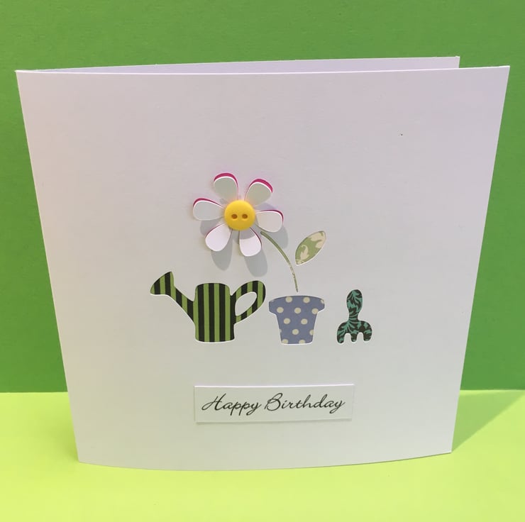 This sweet birthday card is the perfect card for any keen gardener. The watering can, plant pot and fork have all been paper cut and patterned paper has been stuck behind each shape and then embossed so the card is flush. The petals on the flower have been gently folded out with a cute little button in the middle as the finishing touch.
