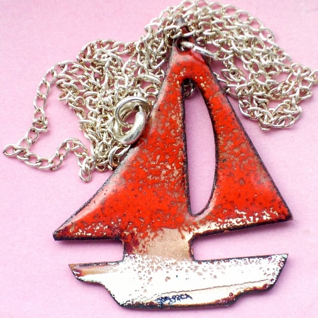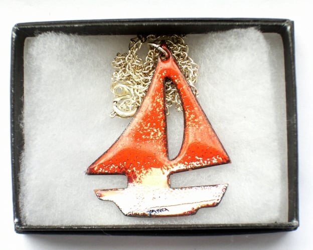 To make this pendant I built a base of clear enamel on the boat shape then covered that with layers of coloured enamels.