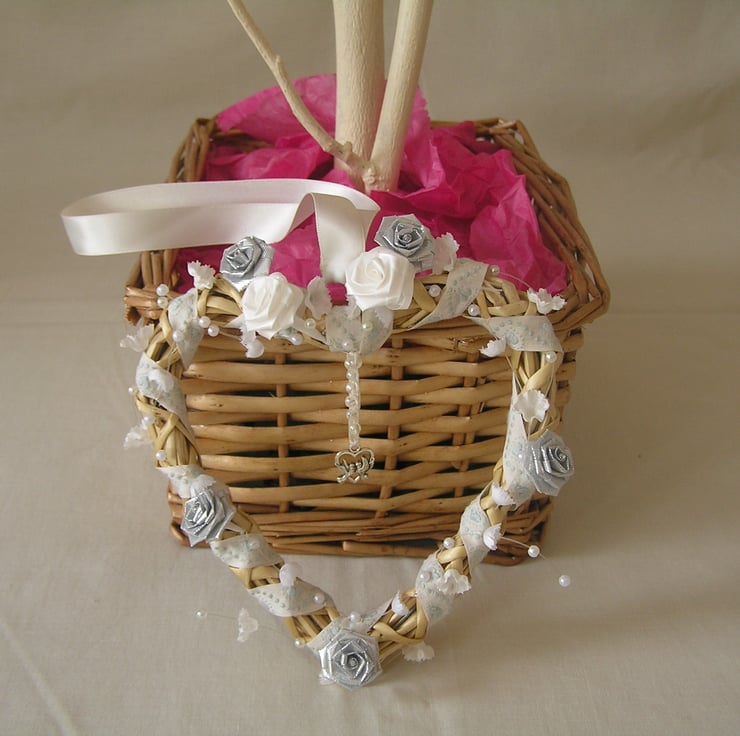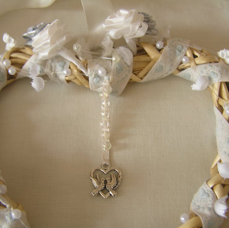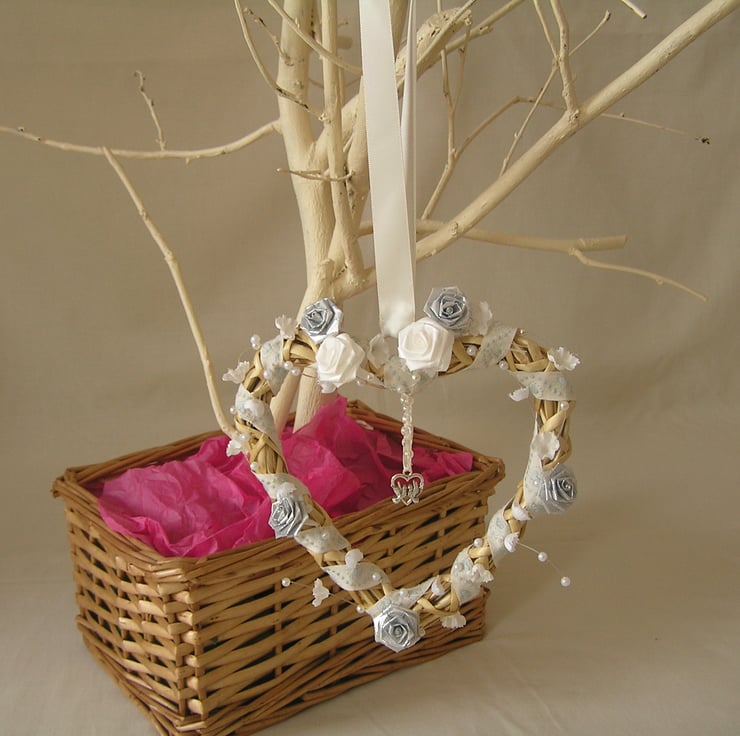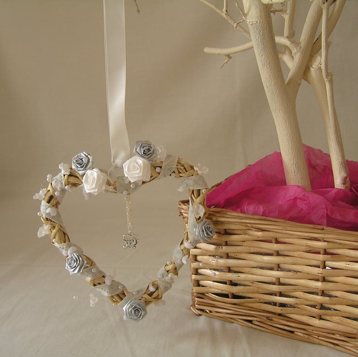 Wicker heart, threaded with a cream and heart patterned ribbon, white and silver flowers, beads and a hanging silver coloured charm in the middle.