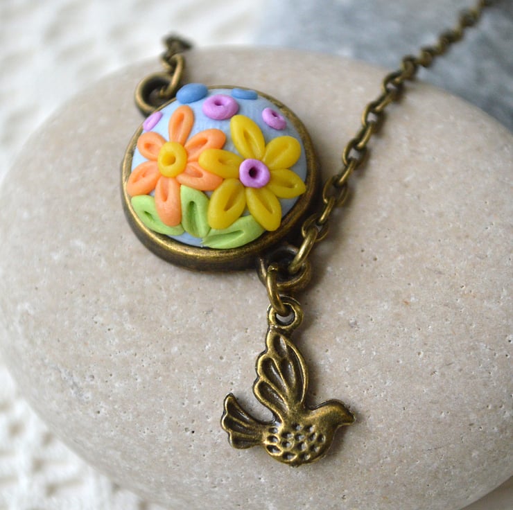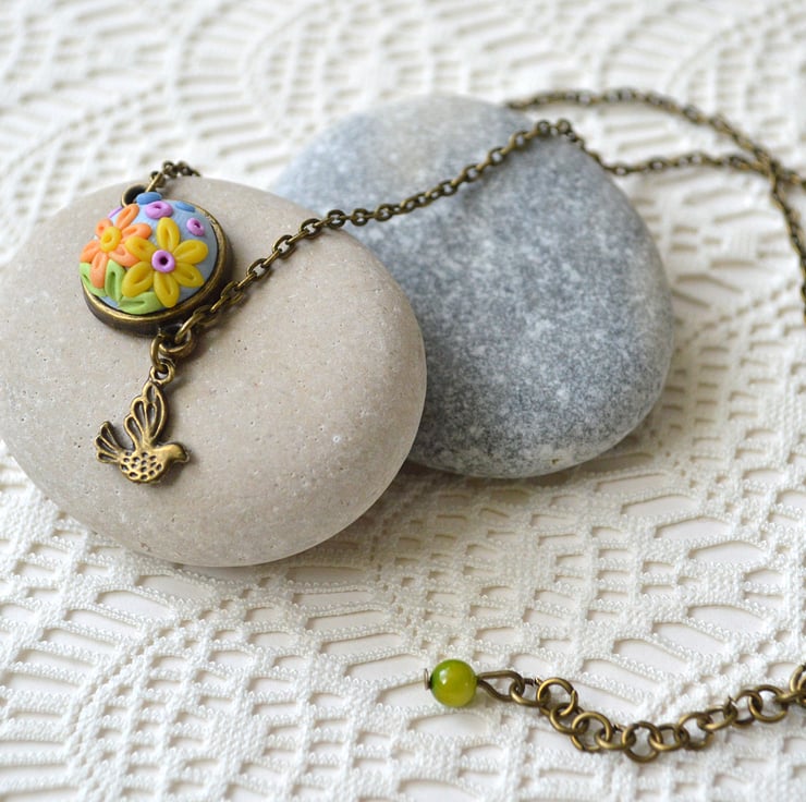 A cute pendant necklace featuring a cabochon, made completely by hand using an intricate applique technique using polymer clay and finished with a bronze bird charm.