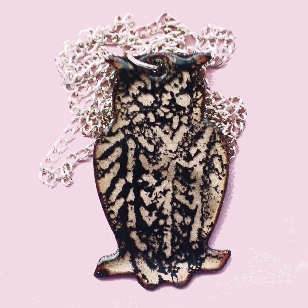 This owl is made in black enamel over clear enamel. Its features, eyes, beak and feathers, were drawn into the black coat before it is fired. It is counter enamelled.