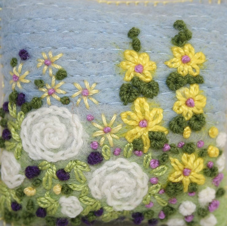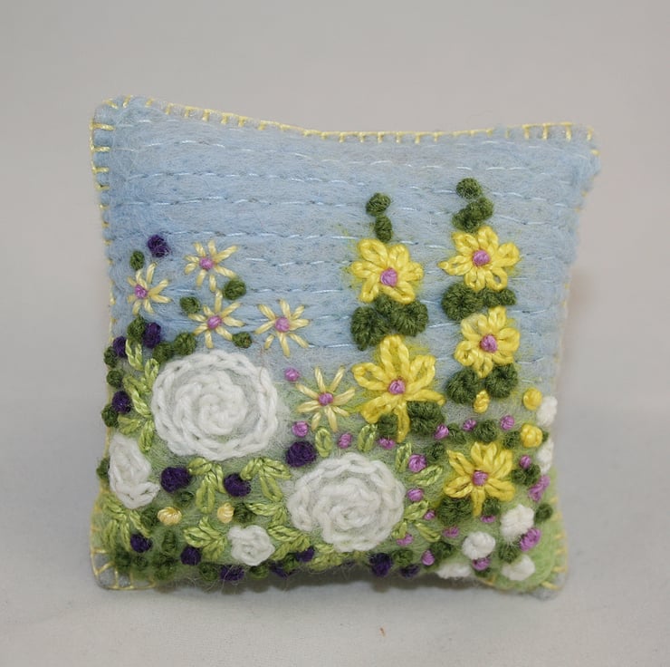 A pretty, felted and embroidered cottage garden border decorates this pincushion.
