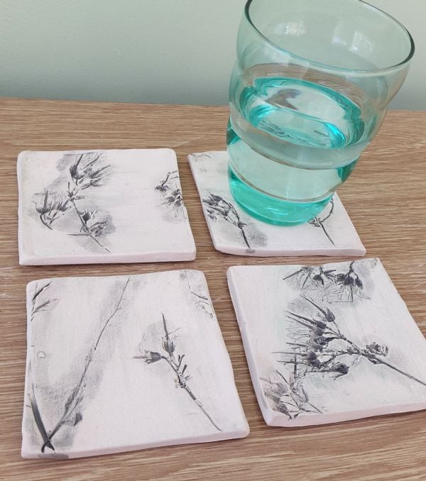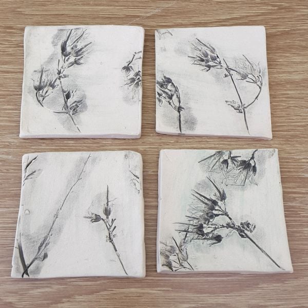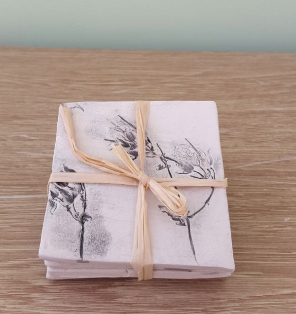 This set of square shaped handmade ceramic coasters are each individually decorated with real flowers and plant life, glazed in a beautiful grey.