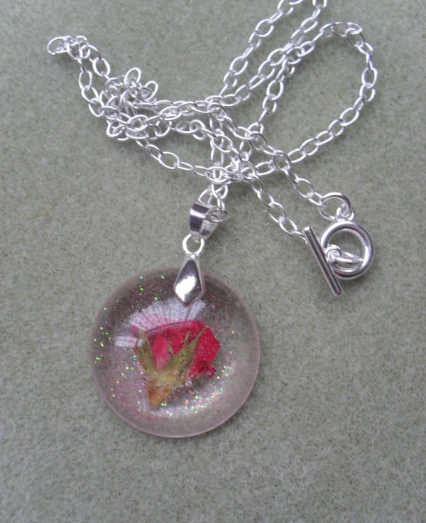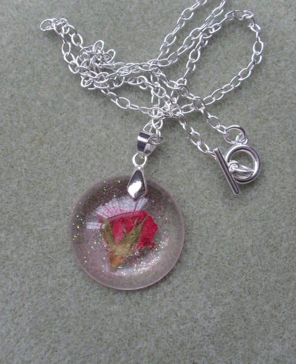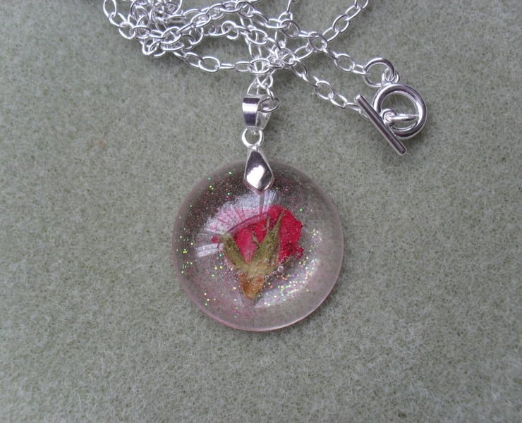SALE was £10 now £5 Red rose bud which has been placed in resin with some tiny glitter particles