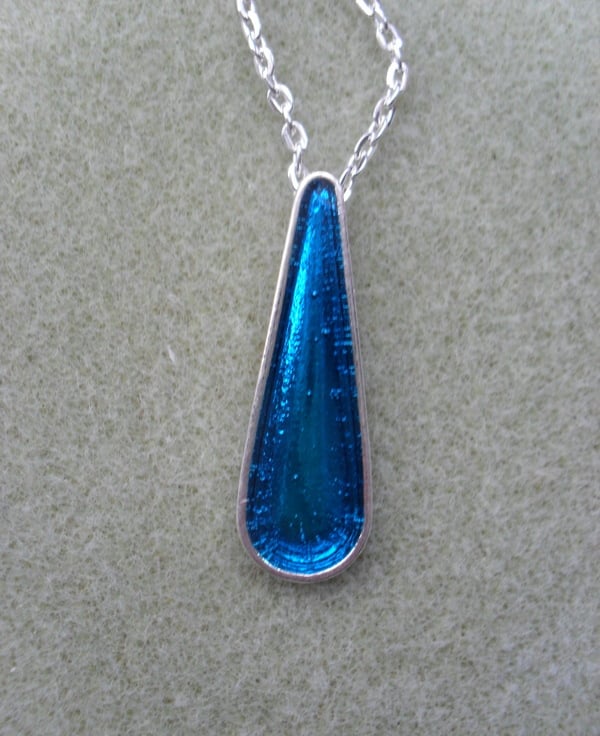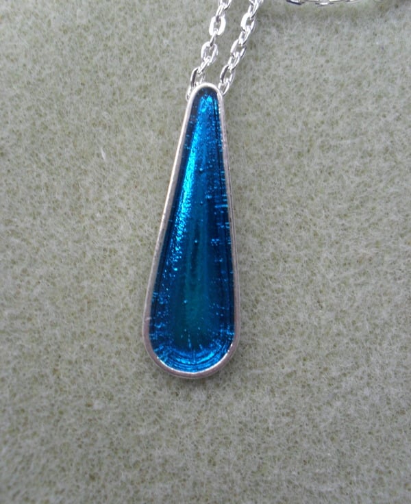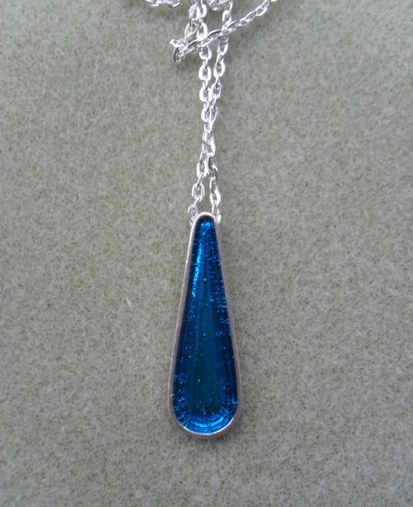 Drop pendant of blue resin in a silver plated mount and suspended from a silver plated chain.