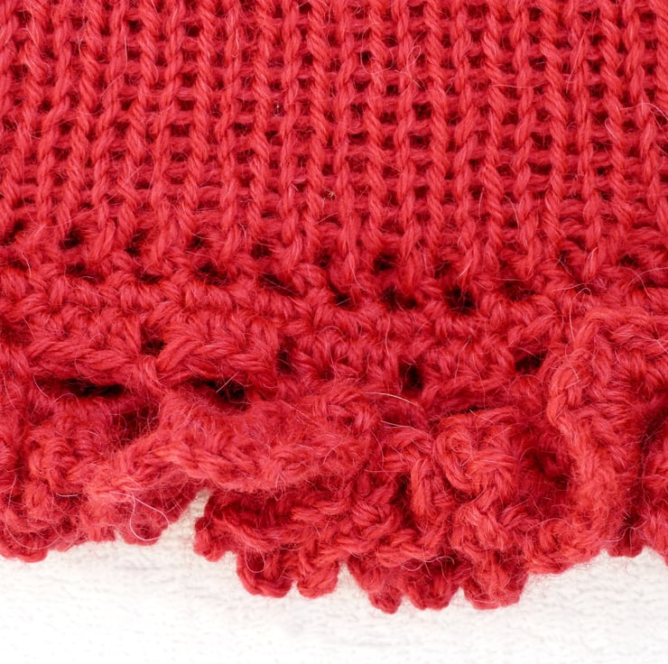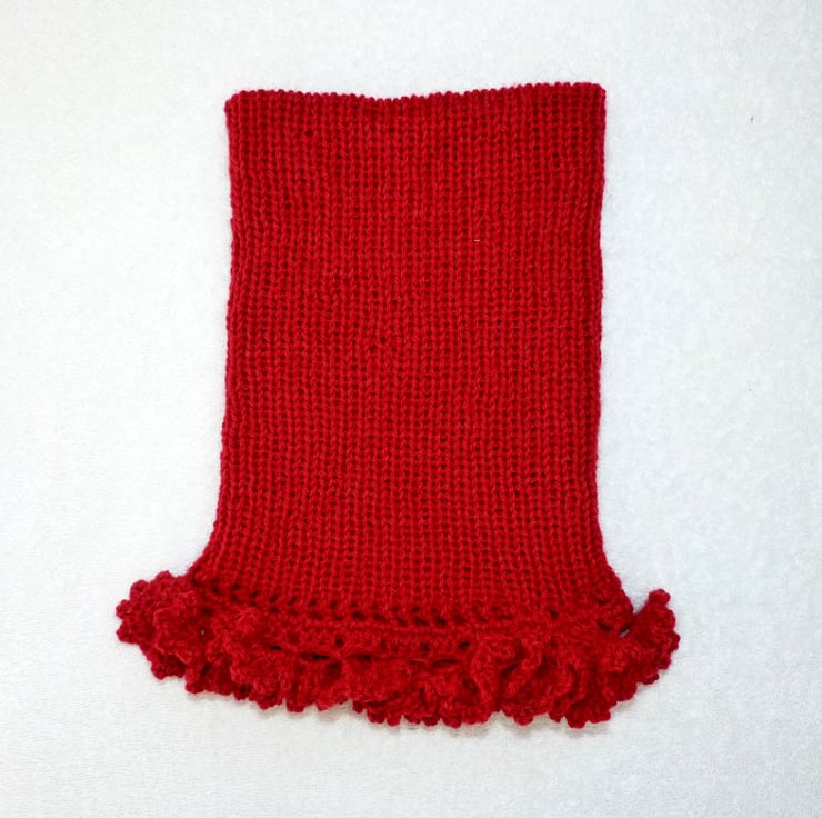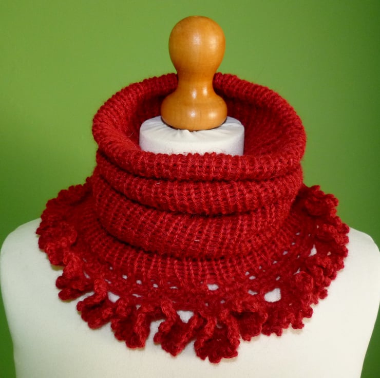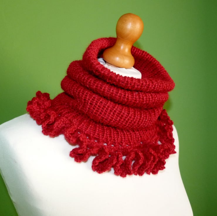 I have hand created this cowl from an Alpaca and acrylic blend yarn. The cowl has a knitted tube, with a ruffle crochet trim. The yarn is a lovely red colour and really soft and cosy.