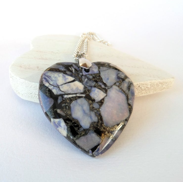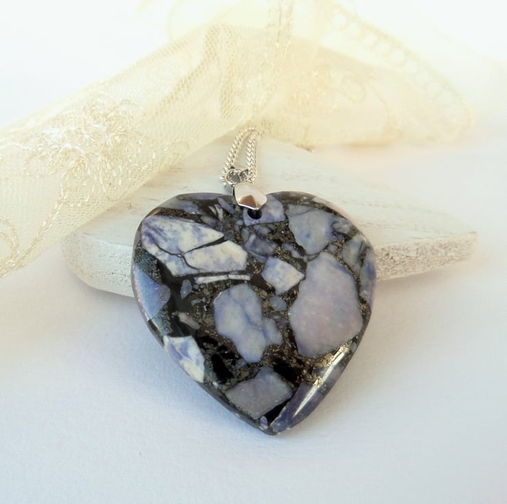 A unique lilac coloured heart shaped sea sediment jasper pendant hanging from a silver plated chain makes a stunning necklace.