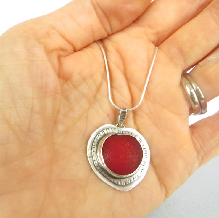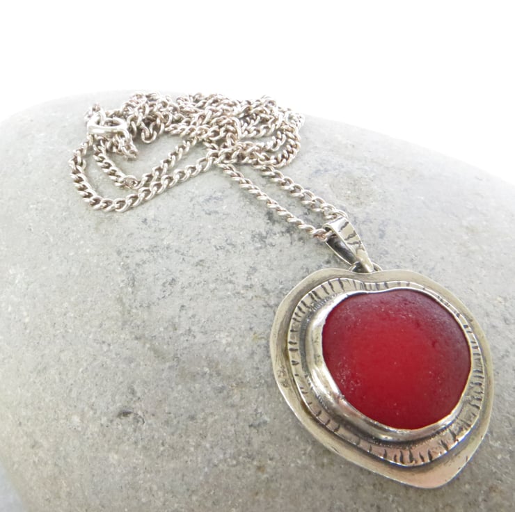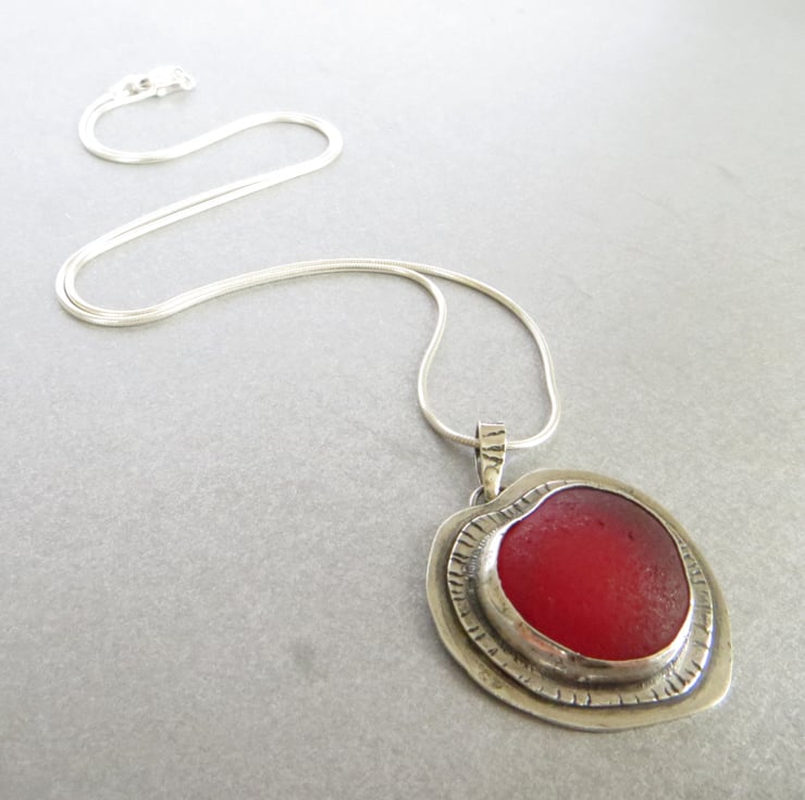 This stunning sterling silver pendant features a piece of red sea glass I picked up last year on the north Norfolk beach. I have bezel set it in fine silver on a double layer of sterling silver which has been textured with a line detail. The silver has been oxidised and then polished to give a dark, vintage feel to the piece. It hangs from a matching handmade bail and your choice of sterling silver chain.