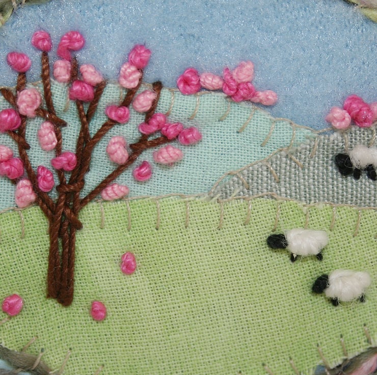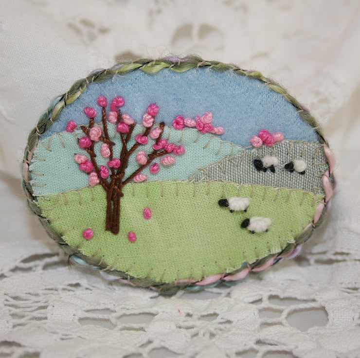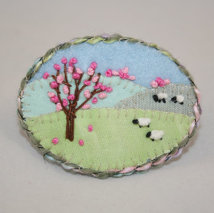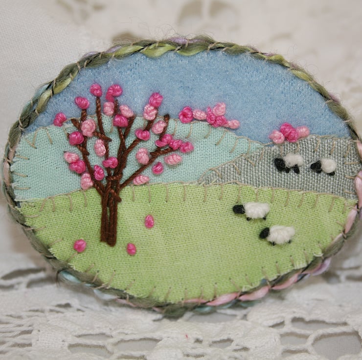 An atmospheric, applique, embroidered landscape featuring a pretty spring scene with sheep and pink blossom, decorates this pretty brooch.