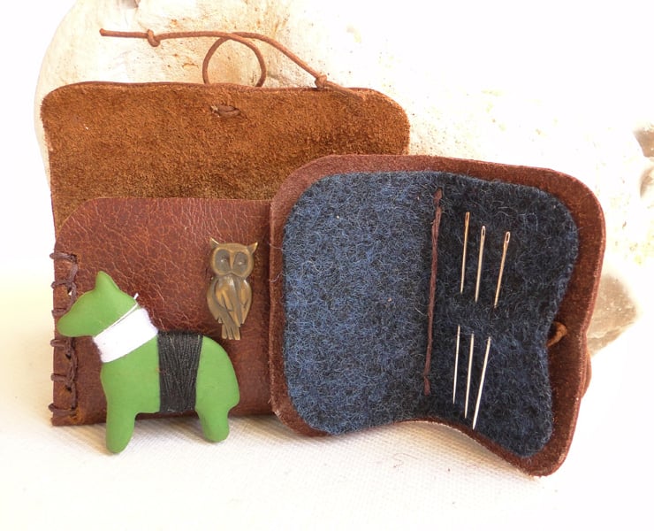 - a small needle case/book measuring 3 1/2 cm x 5 1/2 cm made from leather and blue felt