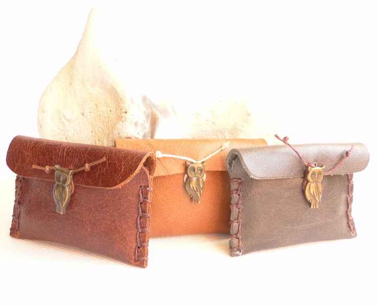 The kit measures 7cm x 4 1/2 cm and is made from brown leather.