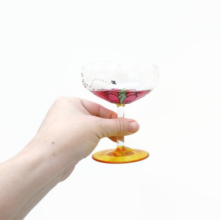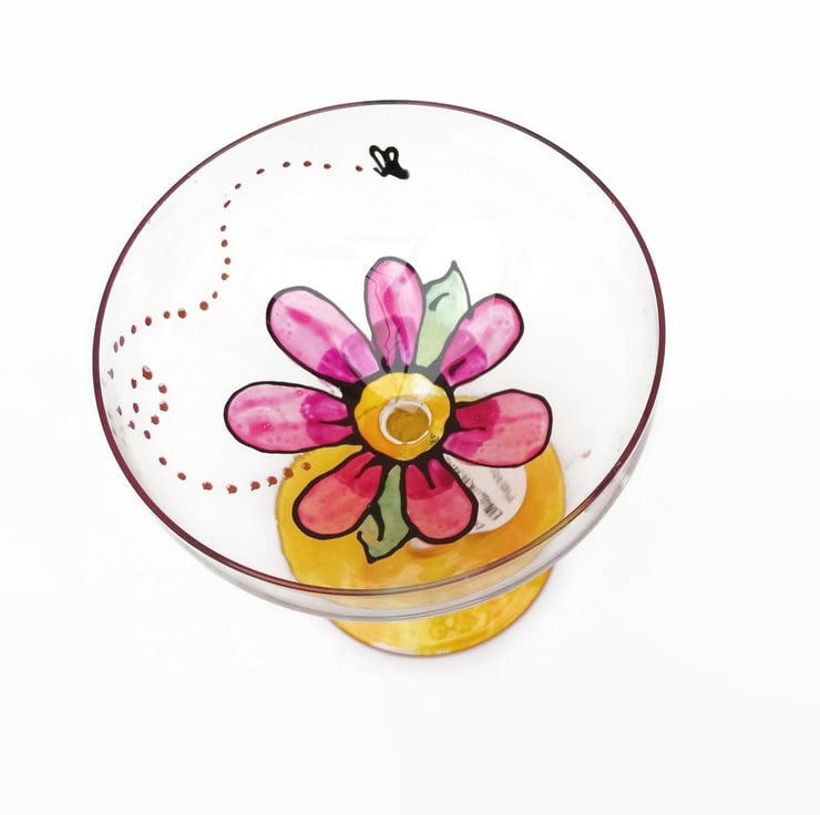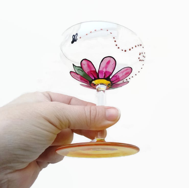 These glasses were painted with non-toxic glass paint. They were heat-set in the oven to make them durable.