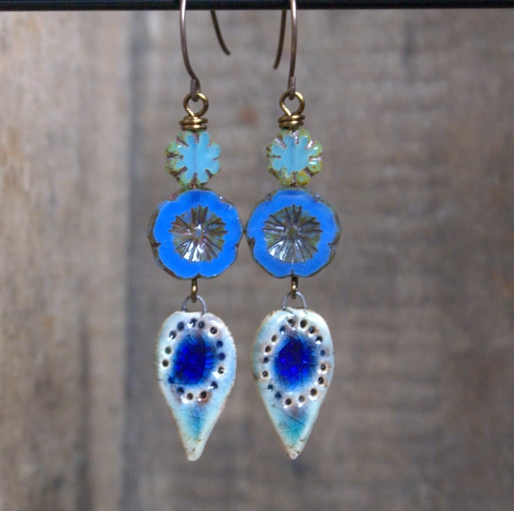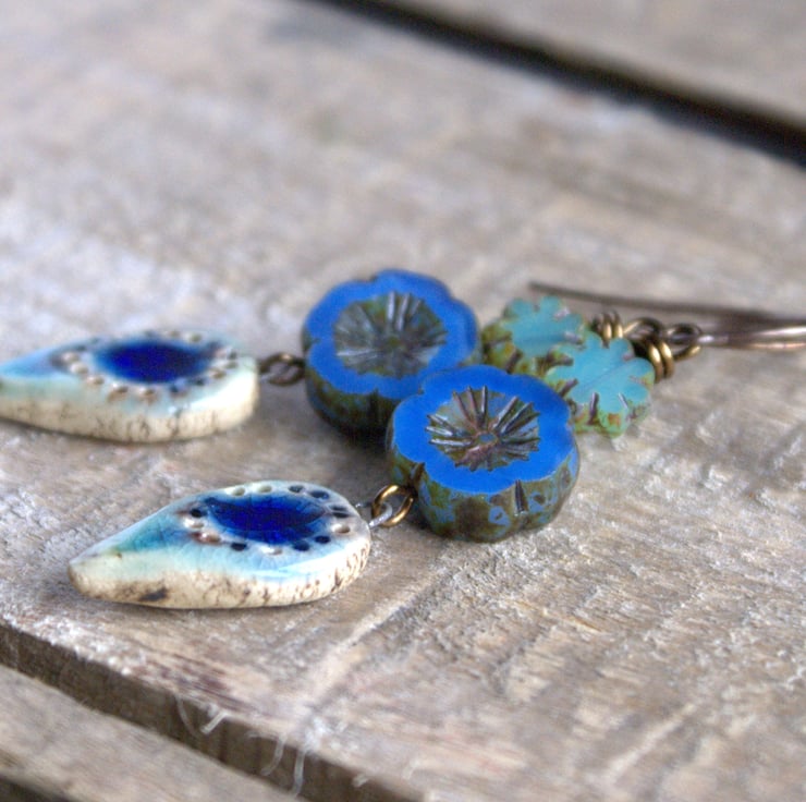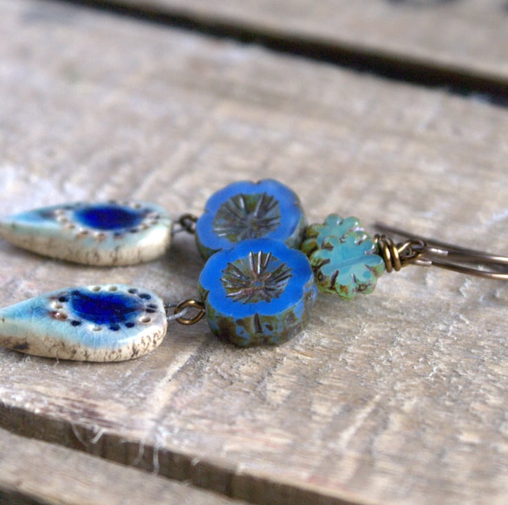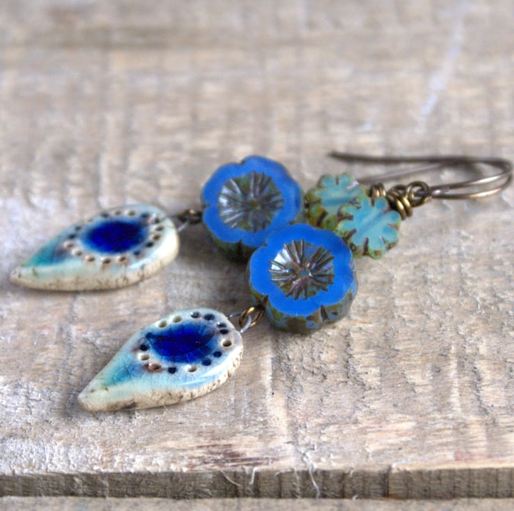 Shades of Blue - Czech Glass Bead Earrings with Artisan Ceramic Charms